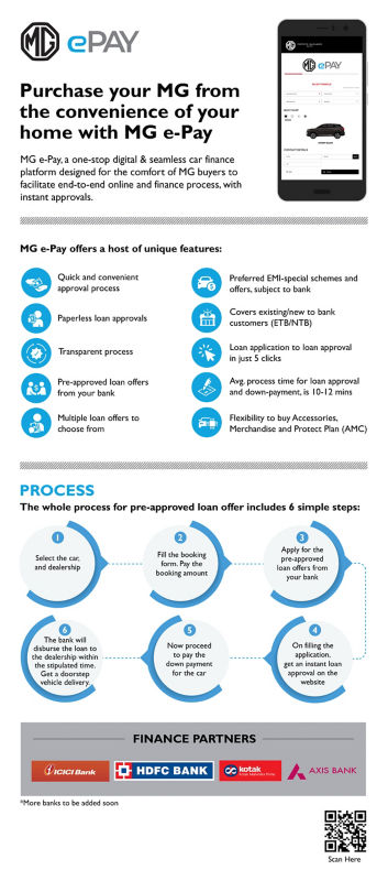 MG e-Pay will simplify the customer purchase journey in 5 clicks and 6 simple steps. Customers now have a choice to book MG cars online or at their nearest MG Dealerships, customizing their cars with accessories, merchandize, protect plans, etc. Further, customers have access to pre-approved loan offers from multiple financiers and can customize the loan tenure, amount, and rate of interest. Customers can avail these financial services online without stepping out of their homes. They can also track loan approval status and sanction letters in real-time and receive their new cars at their doorsteps.